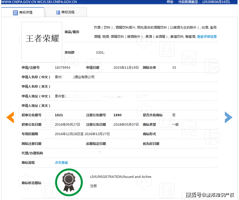 例如,2015年11月9日,贵州某酒企提出了第18379954号“王者荣耀”的注册申请,指定使用在第33类“白酒”等商品上。经过一番波折,这枚商标最终还注册成功了。