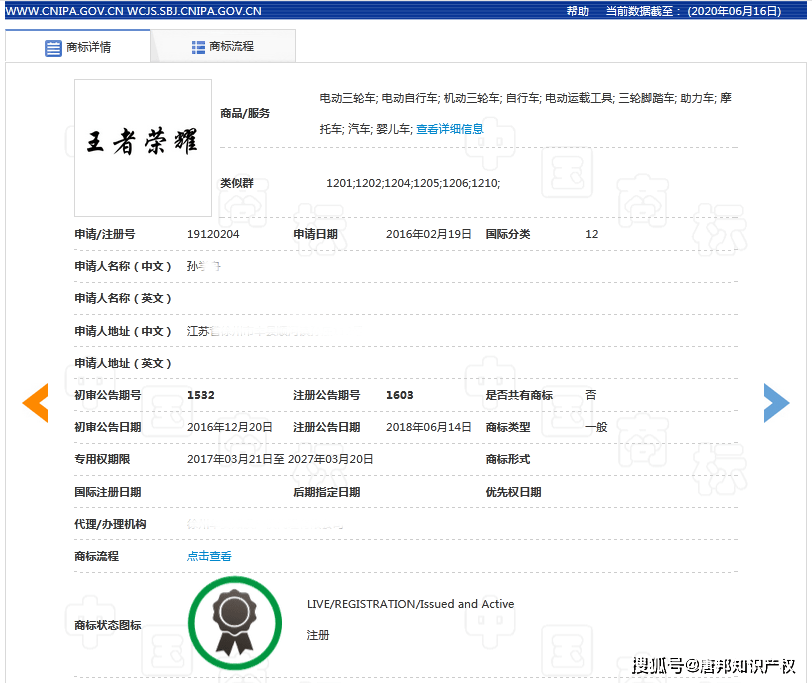 第19120204号“王者荣耀”商标由孙某某于2016年2月19日提出注册申请,指定使用在第12类“电动三轮车;电动自行车”等商品上。该商标的初审公告日期为2016年12月20日,后经商标异议程序被核准注册。
