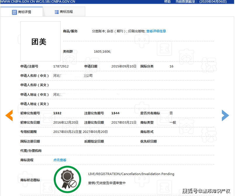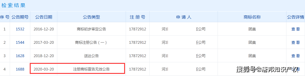 中国商标网信息显示,商标局于2020年3月30日发布了关于第17872912号“团美”商标的宣告无效公告。