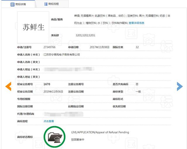 在苏鲜生品牌建立之后,苏宁易购于2017年11月提交了多件“苏鲜生”商标注册申请,其中有6件商标因与他人在先申请注册的“苏先生”商标构成近似被驳回。